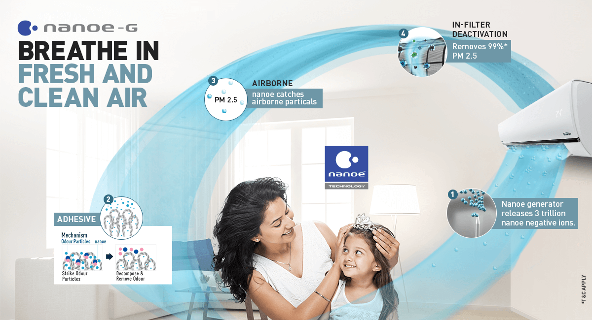 nanoe-G is Panasonic's original air purifying system that uses nano technology fine particles consisting of ions and radicals, nanoe-G works effectively on airborne, adhesive and in-filter trapped micro-organisms such as bacteria and viruses thus providing a cleaner living environment.